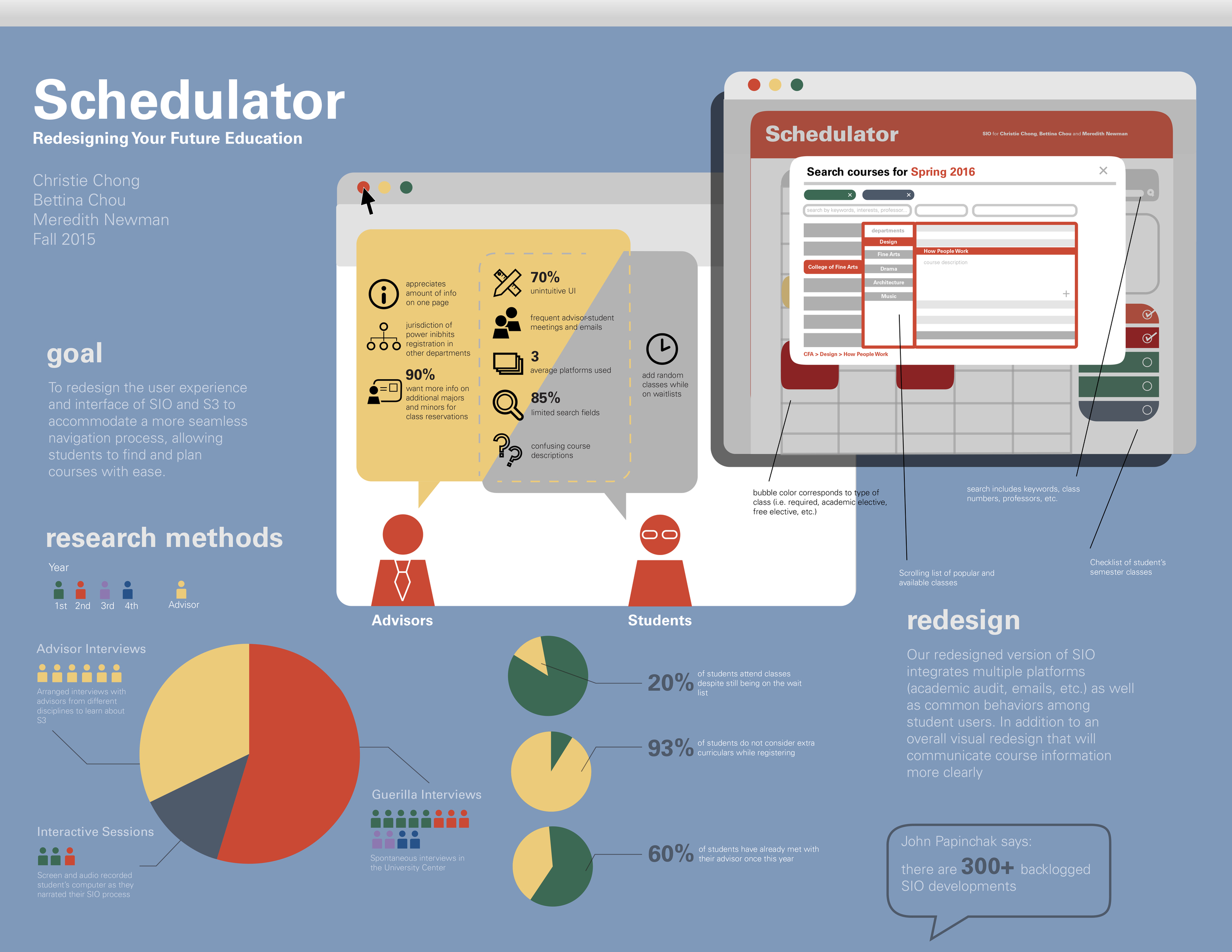 In this collaborative project, Bettina Chou, Meredith Newman, and I sought out to redesign the user experience of Carnegie Mellon University's scheduling portal, SIO. We interviewed advisors and students to understand what would be the best solution to accommodate for a more seamless navigation process, allowing students to find and plan for classes with ease. We also looked at S3, the partner platform of SIO for advisors, to understand obstacles that both advisors and students face.