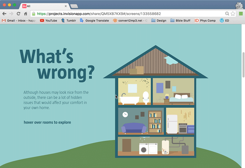 I decided on an interactive website because I wanted this piece to be engaging and inviting, especially the topic of Home Energy Efficiency is usually dealt with numbers and dry statistics. I wanted the user to have a sense of exploration as they discovered each room in the house had problems that they might be able to relate to.